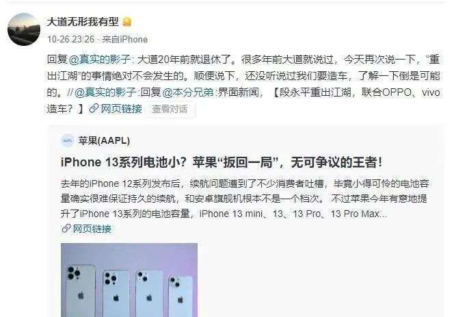 10月26日,针对盛传的“‘OV系’教父段永平将联合OPPO、vivo和小天才,牵头造车”的传闻,段永平在个人社交平台上现身,作出否认的回应。
